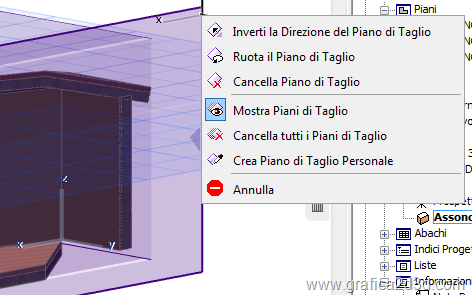 cliccando con il tasto destro del mouse sul piano di taglio appare un menu a discesa che ci permette di impostare una serie di cose