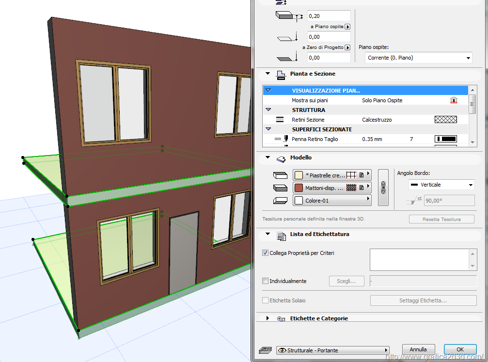 La presenza di queste linee nasce dal fatto che si è realizzato il 3d senza tener conto dei materiali e delle corrette legature tra muri e solai, affinchè archicad leghi bene i muri ed i solai senza linee interne negli alzati è necessario che abbiano lo stesso materiale, quindi assegniamo al solaio interno lo stesso materiale della facciate, ovvero mattoni disp comuni