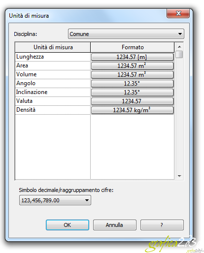 Dalla scheda che si apre possiamo impostare le unità di misura per lunghezze, aree , volumi, angoli ecc.