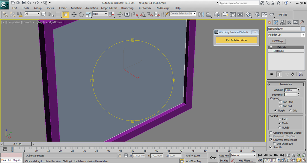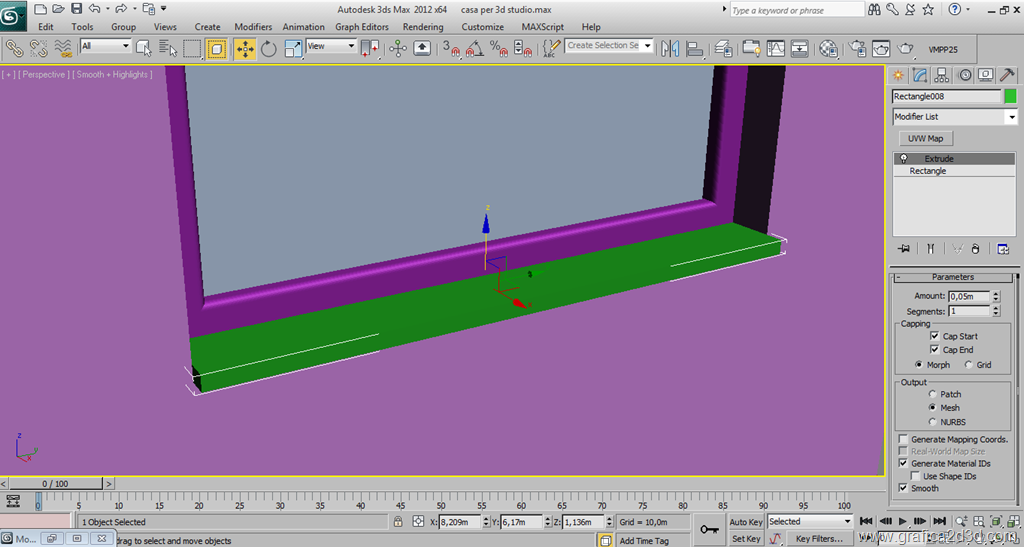 impostiamo a 0,1 la dimensione di estrusione e lasciamo tutto il resto invariato, ecco il telaio della finestra, ne ho fatto anche una copia all’esterno del muro per mostrarlo meglio