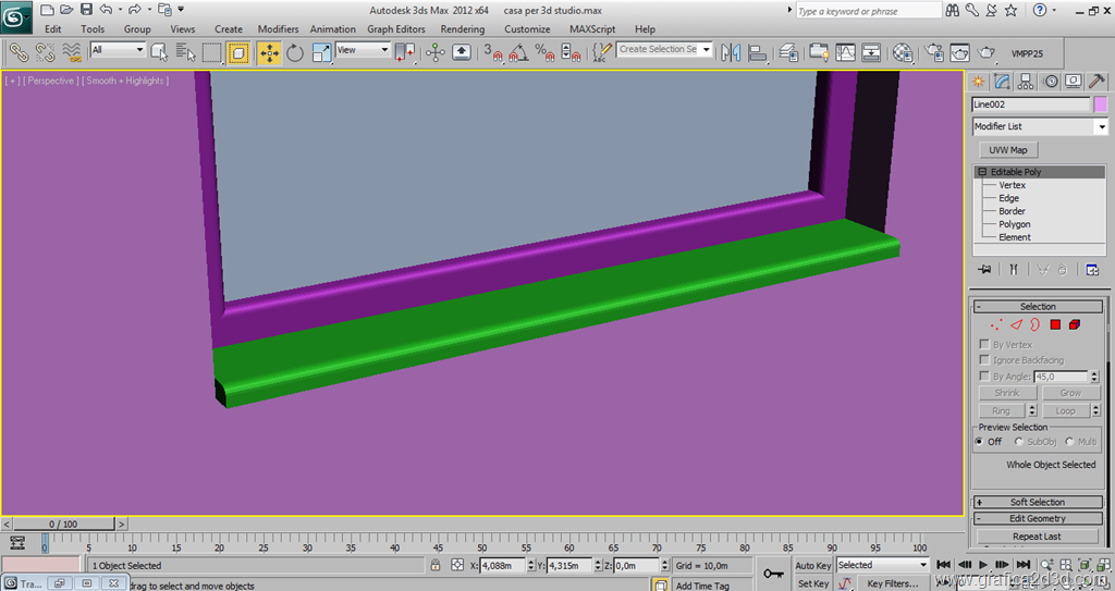 piu tempo abbiamo a disposizione per la modellazione e più possiamo modellare dettagli ed essere precisi, possiamo creare le soglie di marmo per le finestre, creando un rettangolo dalla pianta ed estrudendolo come al solito con il modificatore extrude