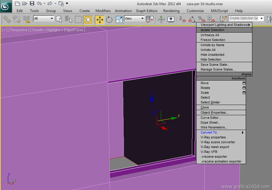 a questo punto, creiamo il vetro, siccome in questa fase il muro della casa può darci fastidio, selezioniamo il telaio della finestra, tasto destro del mouse (isolate selection) per isolare il telaio nascondendo il resto della casa