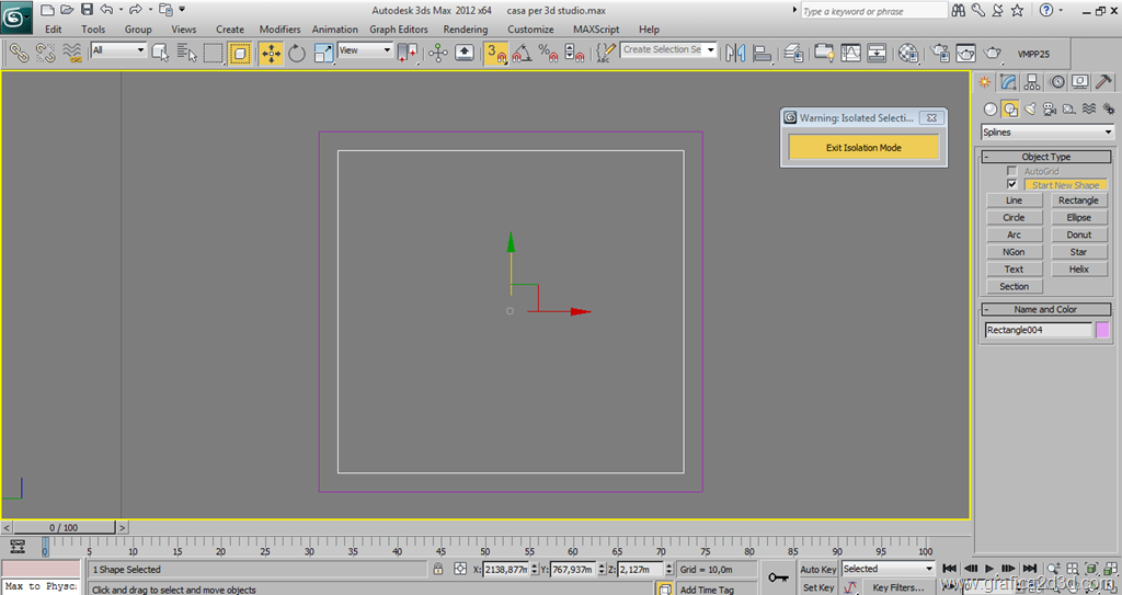 con la spline selezionata, da outline impostiamo 0,10 per creare un ofset del rettangolo di 10 centimetri, per creare il telaio della finestra