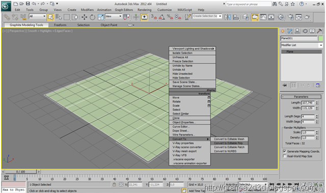 Convertiamo il piano in un oggetto poligogonale con tasto destro sull’oggetto e scegliendo convert to . editablepoly