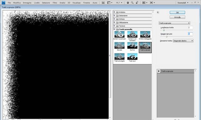 E andiamo nei filtri a scegliere un filtro che simuli la sfrangiatura ai margini della foto, io ho scelto il tratto a spruzzi che anche se non simula esattamente la carta consumata delle vechie fitografie mi piaceva comunque come effetto, regolo la lunghezza tratto e raggio spruzzo a valori proporzionati con la foto e do l’ ok