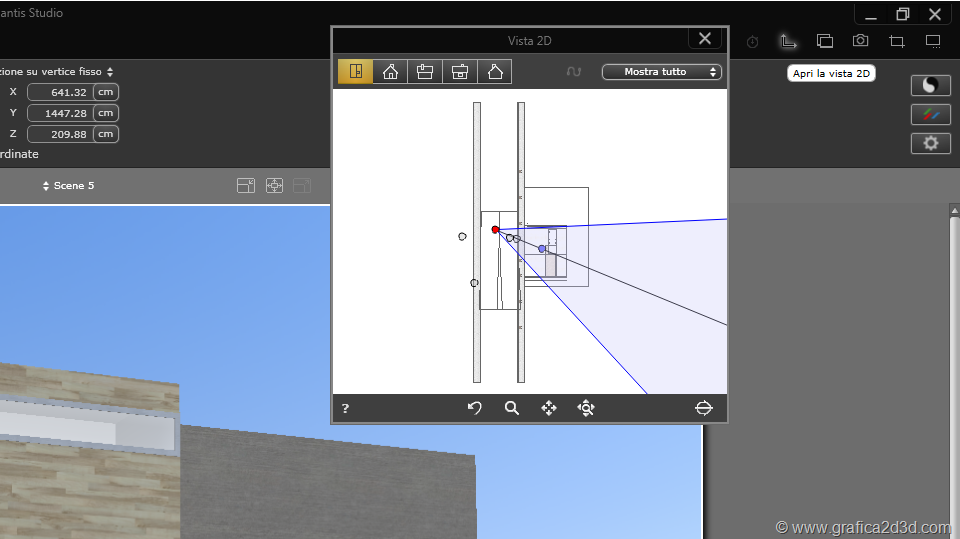 dal tasto apri la vista 2d in alto apriamo la vista 2d che ci permette di scegliere l’inquadratura che più ci piace
