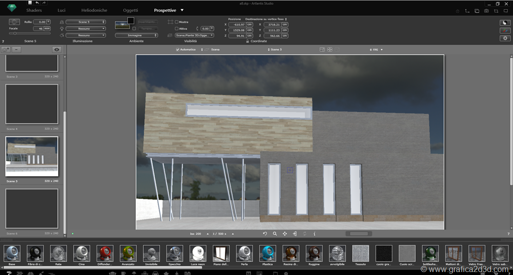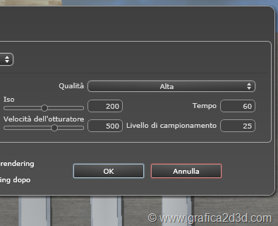 Come accennavo prima in corso d’opera della creazione del render posso variare l’ISO e la VELOCITA’ DELL OTTURATORE della telecamera che permettono di variare l’illuminazione del render, i risultati si vedono immediatamente nell’anteprima piccola e pian piano i nuovi settaggi vengono inviati anche all’immagine grande che sarebbe poi il nostro render reale