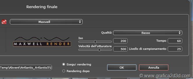 come motore di render mettiamo maxwell e qualità bassa, le altre voci possono essere lasciate di default