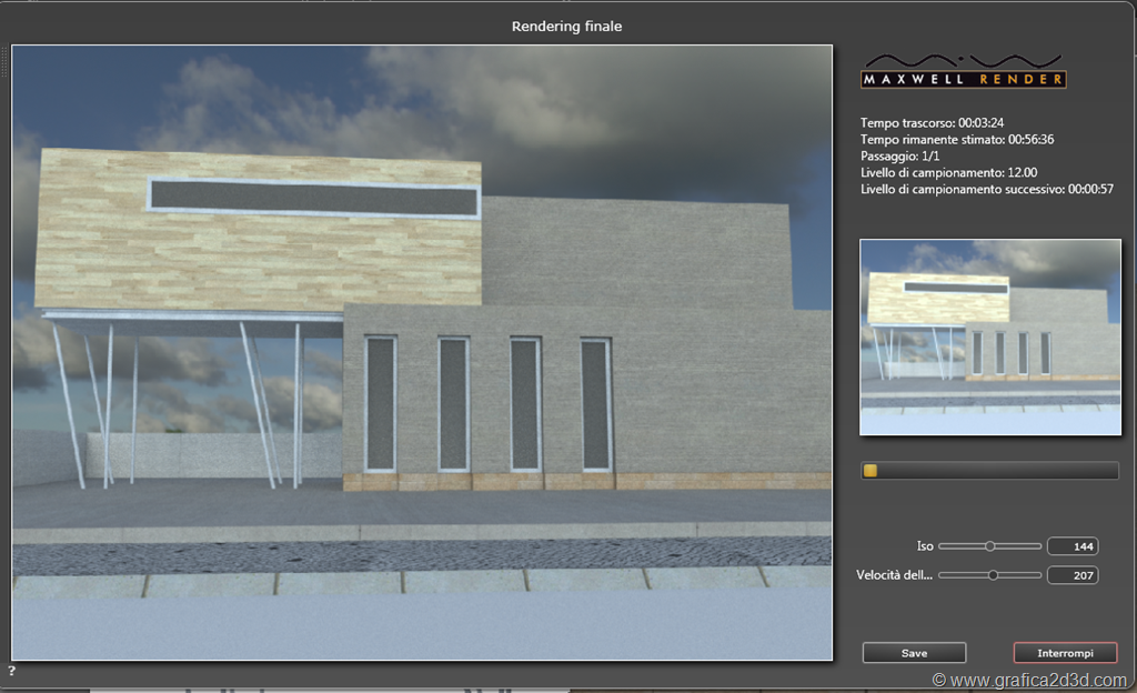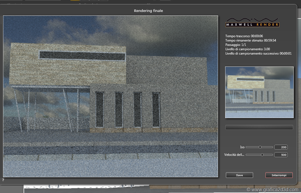 il render parte puntinato e man mano che l’immagine viene elaborata diventa sempre più nitida, il render può essere salvato in qualsiasi momento, ovviamente conviene salvarlo con un immagine più nitida possibile, quindi conviene lasciarlo più tempo possibile