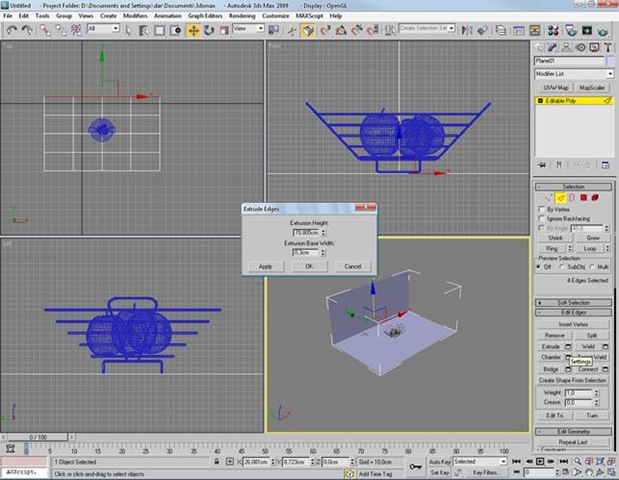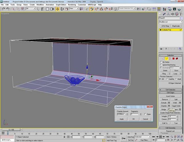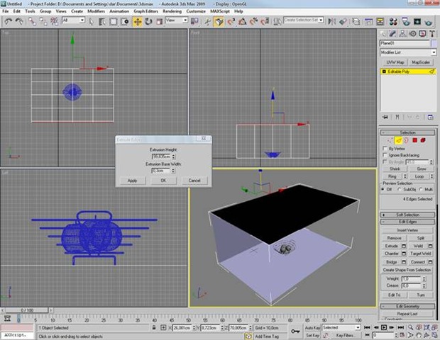 Creo un piano che converto in editable poly in modo da poterlo estrudere per creare la parte verticale e superiore del box che conterrà la mia scena![]()
