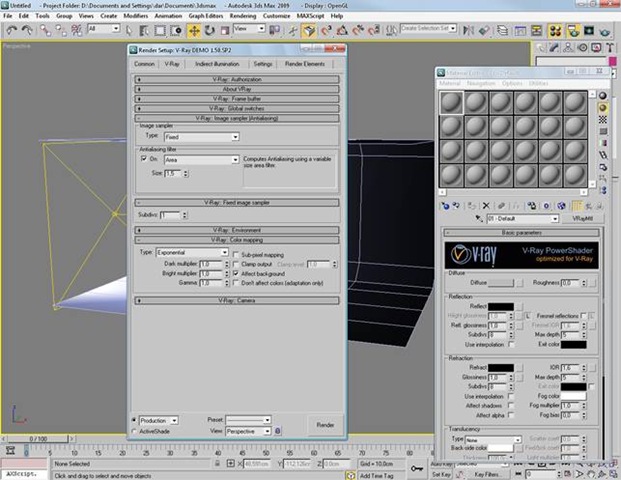 Solitamente quando si è alla fase iniziale di studio della luce non conviene impostare subito i materiali che fanno perdere tempo nel lancio del render, conviene quindi creare un semplice materiale vray bianco e applicarlo nel pannello override mtl, in questo modo tutti i materiali della scena avranno il materiale impostato qui