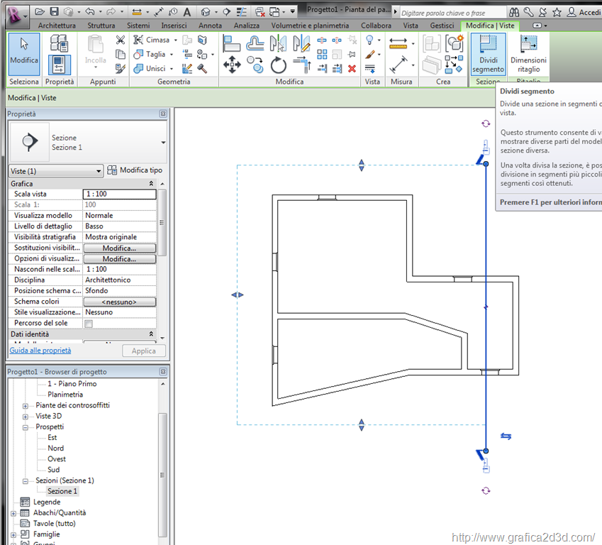 ora per creare il taglio selezioniamo la sezione e dalla barra superiore scegliamo dividi segmento