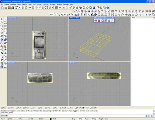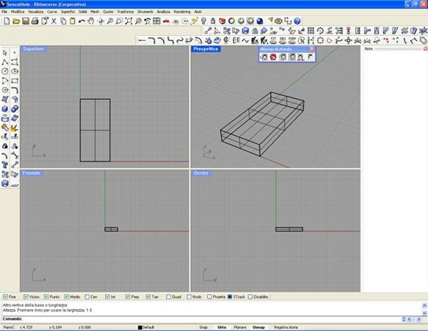 A questo punto apriamo rhino e creiamo un box delle stesse dimensioni del cellulare, il box deve avere come origine il punto 0,0,0 creiamo quindi un box di 5 x 10,5 x 1,5