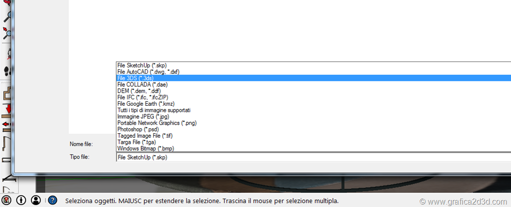 ora per importare in sketchup se si tratta del formato 3ds l’import di sketchup tra i vari file riporta anche il 3ds