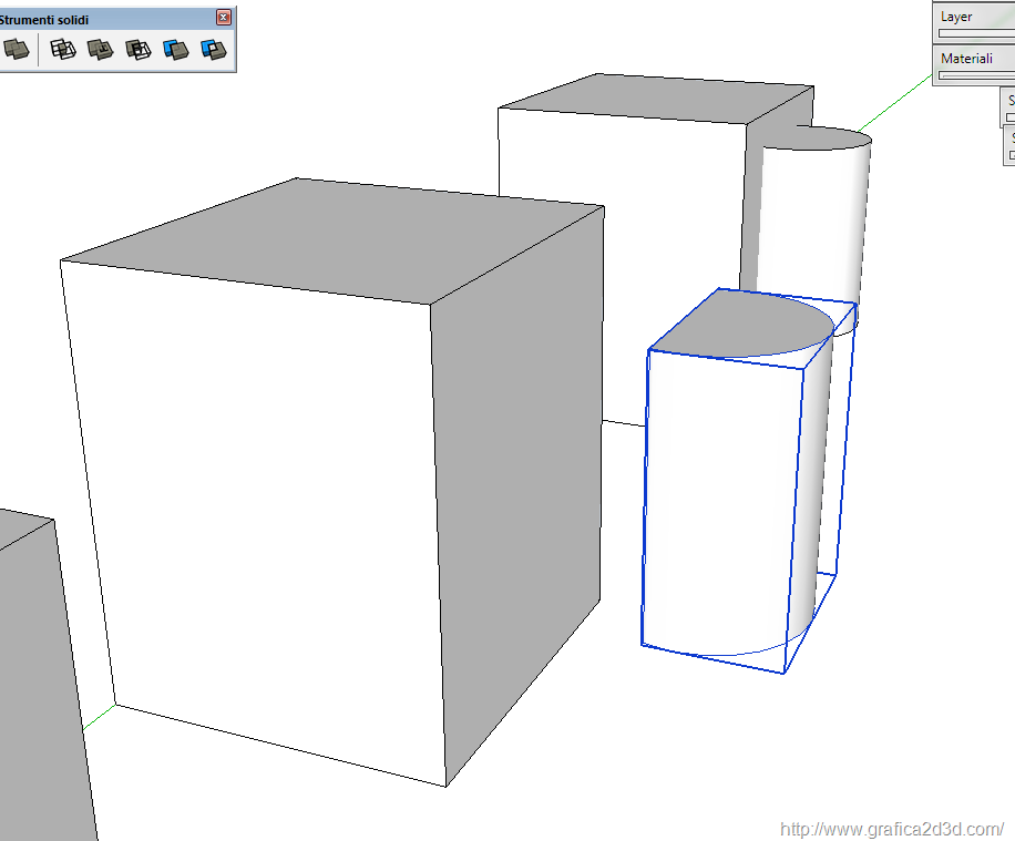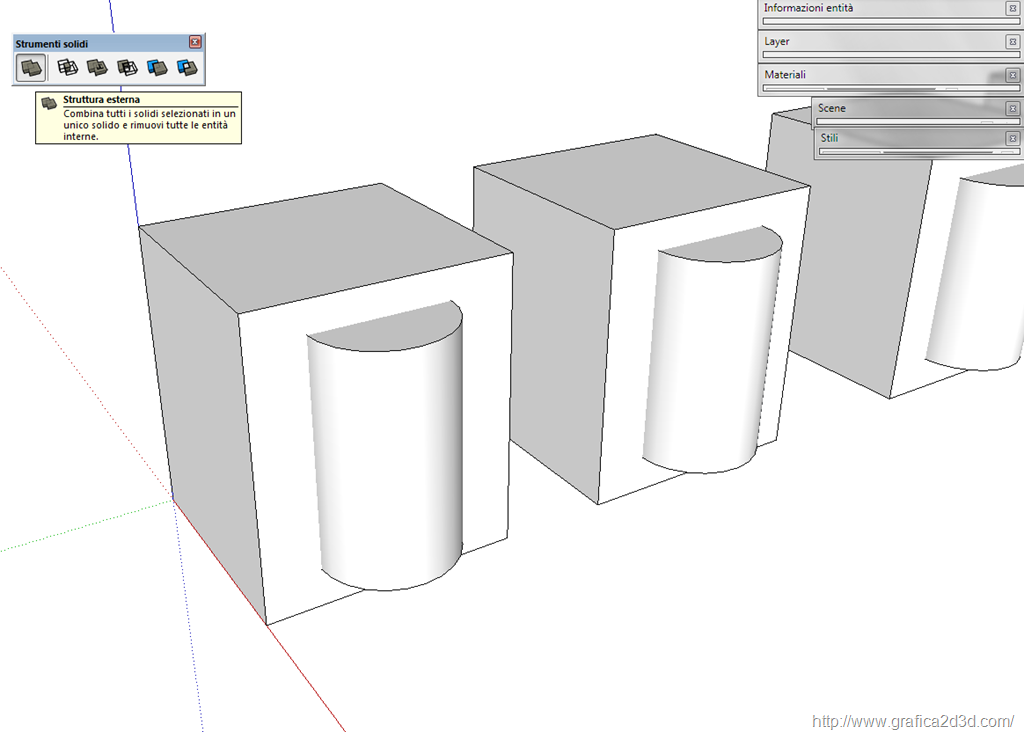 Una delle nuove funzioni di sketchup 2013 sono gli STRUMENTI SOLIDI,molto comodi per creare forme complesse partendo dall’ unione, sottrazione o intersezione di forme più semplici.