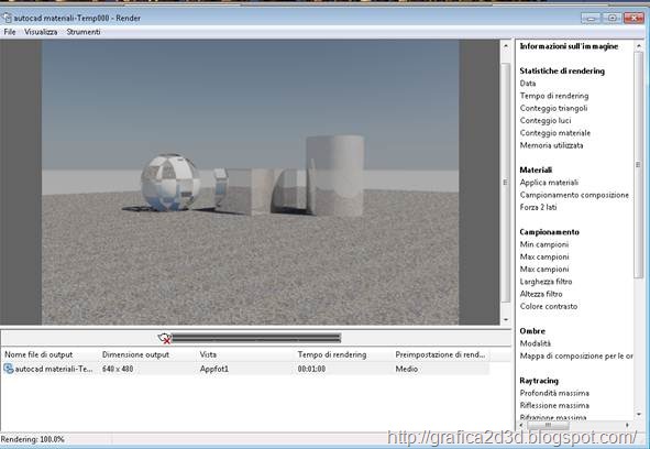 Nella parte a destra e in basso della finestra troviamo una serie di informazioni che riguardano il render e l’immagine finale ottenuta
