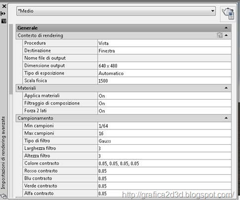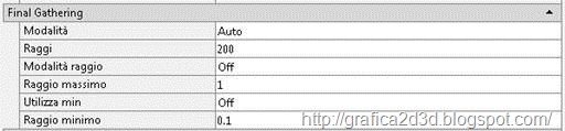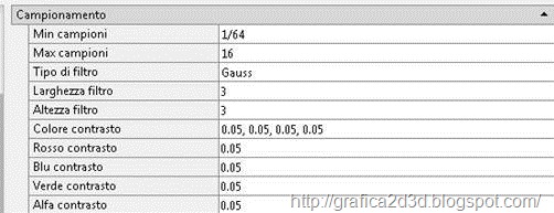 Min e max campioni rappresentano il numero minimo e massimo di campioni da tenere in considerazione nel calcolo dell’antialiasing, più questi numeri sono alti e più il render sarà preciso ma i tempi aumenteranno. Nel presettaggio bozza i valori di min e max sono 1/16 e 1/4 mentre per il livello presentazione che è quello più avanzato sono pari a 4 e 16.