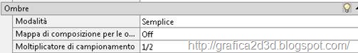 Con questo pannello si regola la qualità delle ombre, ci sono tre modalità semplice, ordinato, segmentato la qualità ed anche i tempi di render aumentano dal primo al terzo