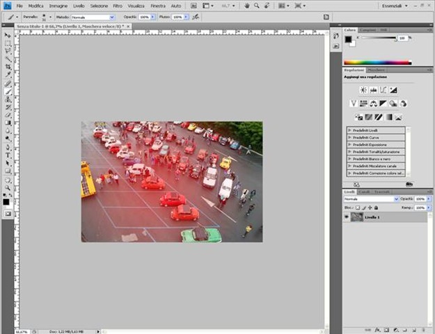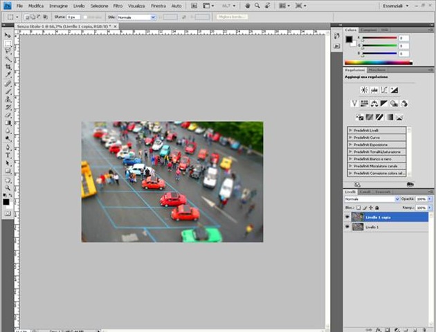 Per ottenere un effetto tipo modellino dobbiamo creare innanzitutto una sfocatura della scena lasciano solo un soggetto senza sfocatura, la sfocatura da l’impressione che i soggetti siano molto più piccoli e lontani di quanto lo siano effettivamente, seconda azione rendere i colori più saturi tipo modellino.