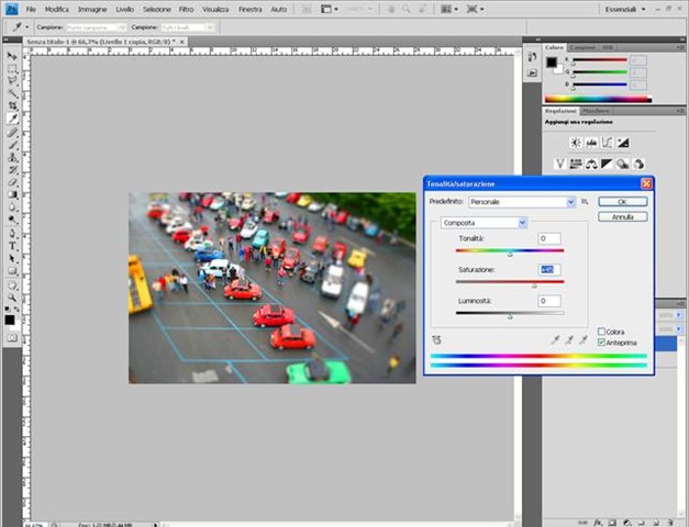 Usciamo duplichiamo il livello e dal menu immagine – regolazione –tonalità saturazione aumentiamo la saturazione facendo apparire cosi tipo un modellino