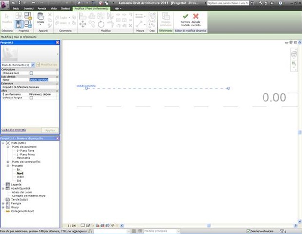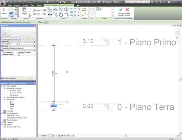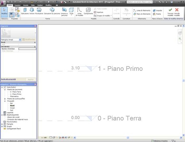 Per creare il piano dal browser di progetto vado in una vista di prospetto dove trovo i livelli piano terra e piano primo che revit crea di default