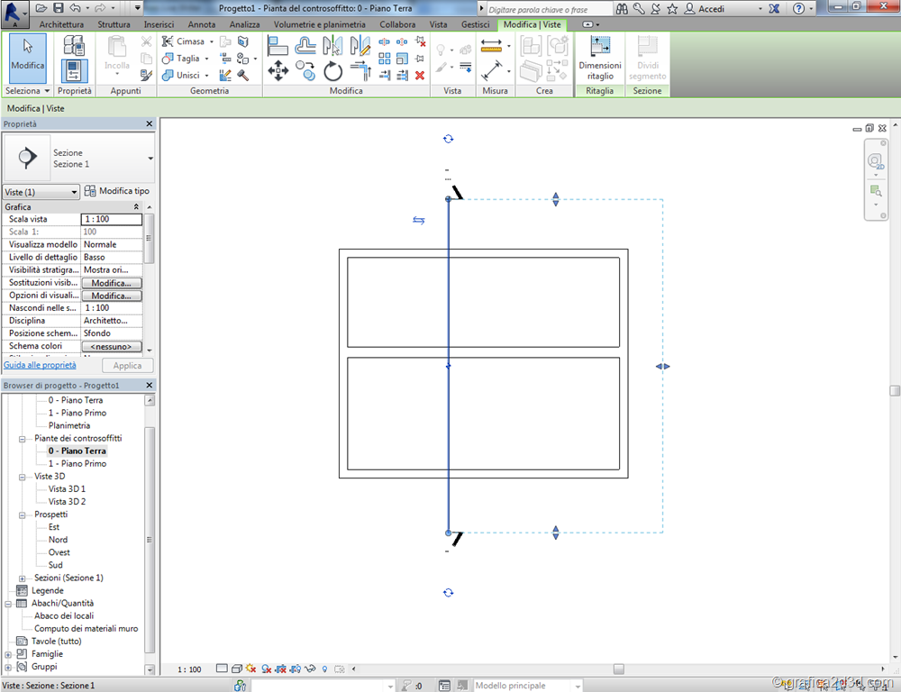 clicchiamo sulla linea di sezione, il cursore assume la forma di un taglierino, clicchiamo sulla riga della sezione che si spezza in quel punto diventando a baionetta
