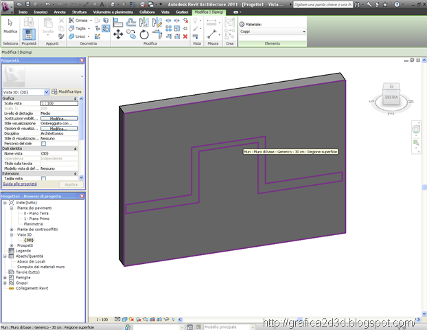Una bellissima funzione in Revit è DIVIDI SUPERFICE che consente di disegnare su una superfice 3d un area per trasformarla in un solido 3d indipendente dal muro sul quale applicare altri materiali, sicuramente una bella funzione che evita di dover creare solidi sovrapposti, come si deve fare con altri programmi bim, che in questo modo sporcano con linee aggiuntive sia il 2d che il 3d.