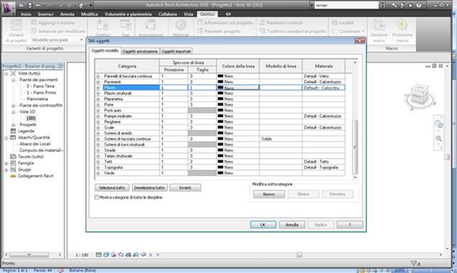 In questa scheda utile se dobbiamo cambiare i materiali di molte categorie troviamo tutti gli elementi 3d che è possibile creare in revit con accanto il loro materiale di default