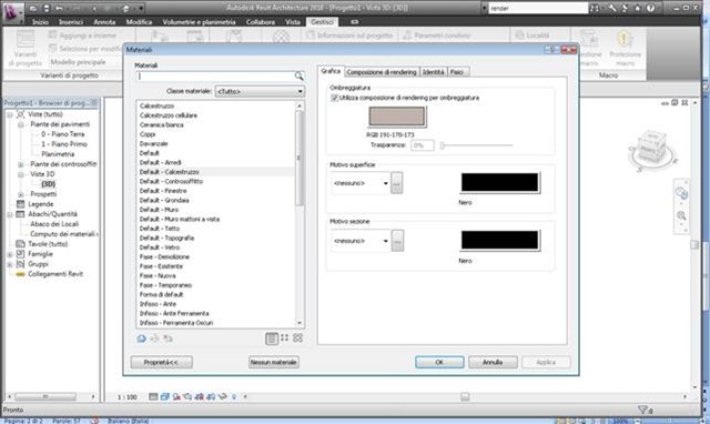 si apre la scheda di impostazione materiali, la stessa è anche raggiungibile dal pannello