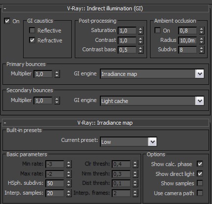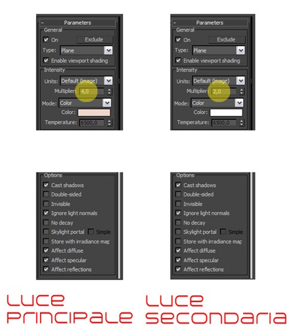 Le luci ovviamente sono vray light, la luce principale avrà un intensità superiore rispetto a quella secondaria, quasi il doppio