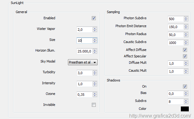 clicchiamo sulla M azzurra sul rigo GI Color per andare a settare le caratteristiche del sole