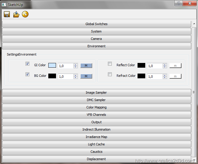 Per ammorbidire i bordi delle ombre entriamo nel pannello opzioni di vray alla voce ENVIROMENT![]()