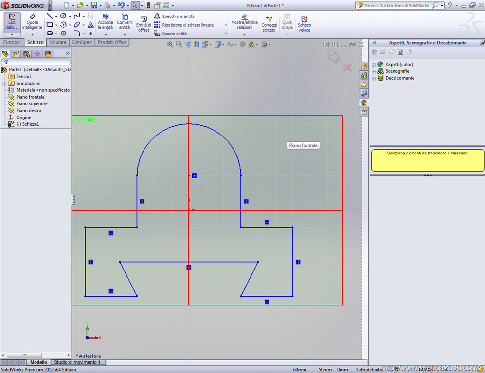 Vediamo come creare una semplice piastra con solidworks, entriamo nello schizzo del piano frontale, cliccando sull’icona schizzo che appare cliccando sul piano