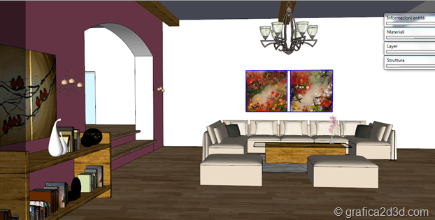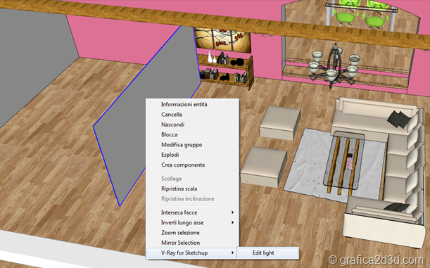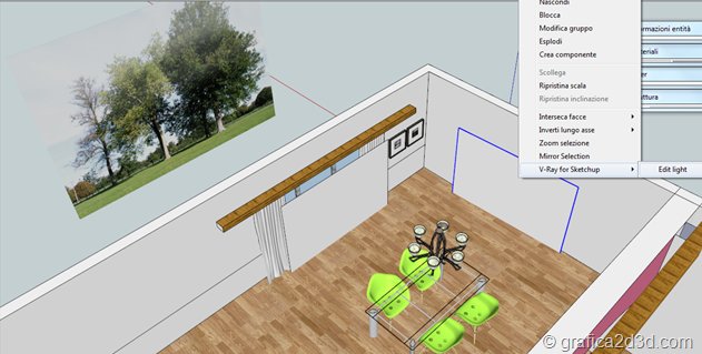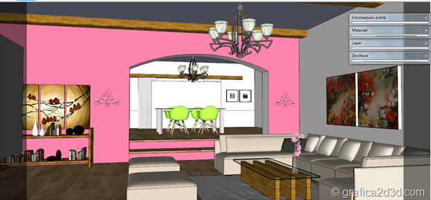 Il modello relativo alla scena è stato realizzato con sketchup 2014, gli oggetti reperiti da vari siti tra cui l’ottimo sketchuptexture.com e dalla google warehouse di sketchup la libreria gratuita di oggetti 3d per sketchup.