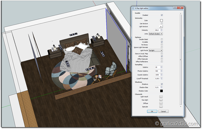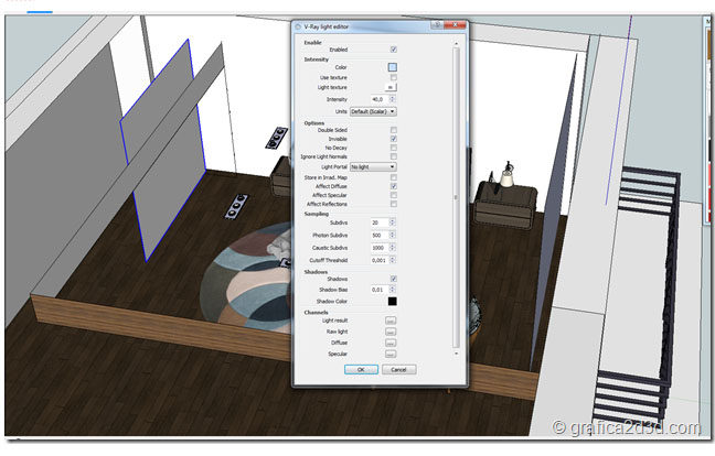 Il sistema delle luci prevede 2 vray light una alla finestra e una laterale per bilanciare le zone più scure del render
